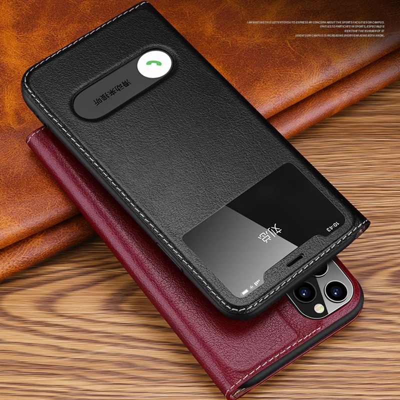 Product Name: Funda de lujo con textura de lichi de cuero genuino con tapa para iPhone 11 Pro Max 7 8 Plus X XS XR Window View Phone Bags funda con soporte