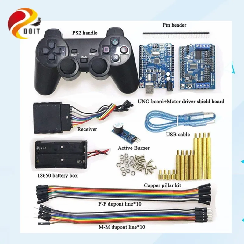 Product Name: Control inalámbrico de la manija RC Kit con UNO Board + Motor Drive Shield Board + mango para Arduino Robot tanque coche Compatible con PS2