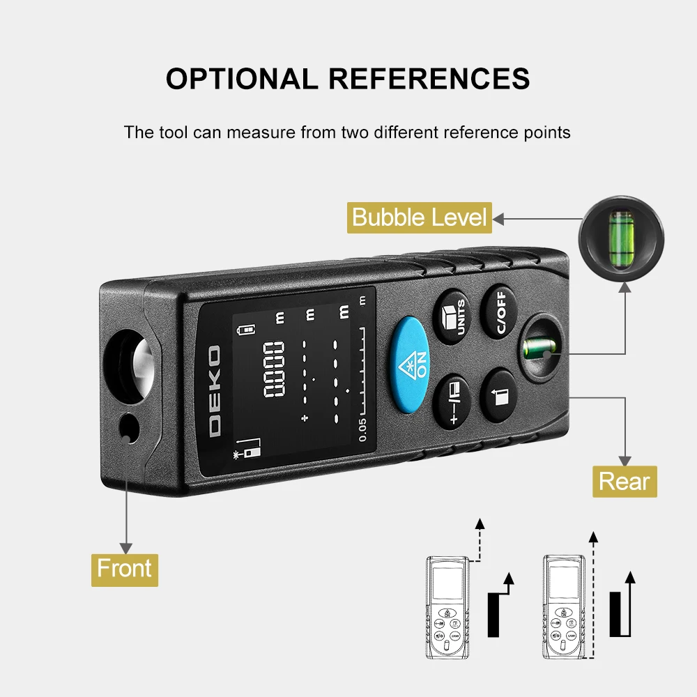 Product Name: Original DEKO LRD110 medidor de distancia láser de mano 50M Digital de doble medida telémetro láser distancia área volumen pitagórico