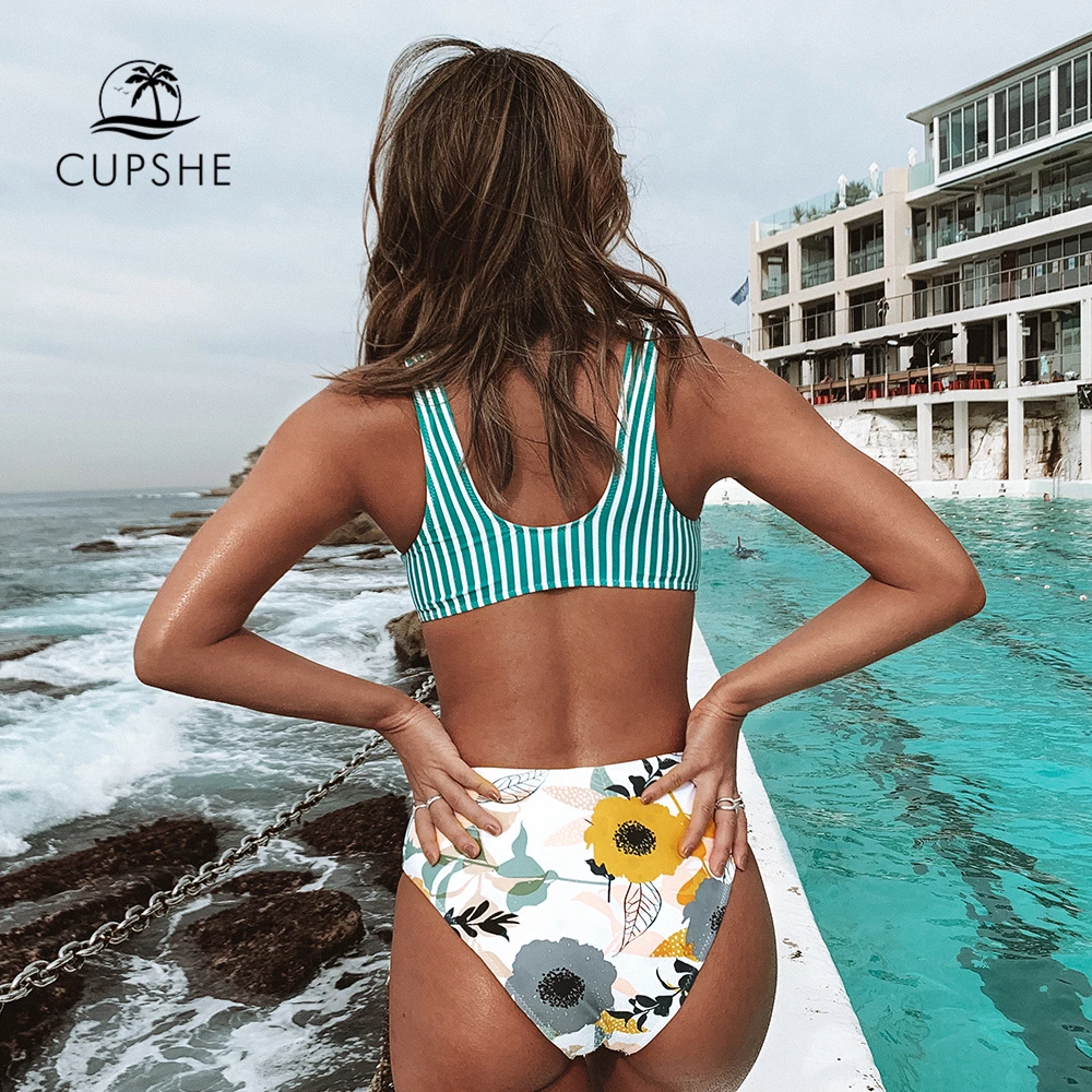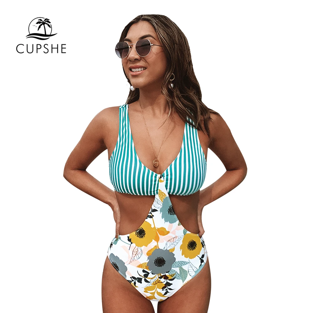 Special Offer CUPSHE Aqua rayado y Floral cortado traje de baño de una sola pieza Sexy de corte alto mujeres Monokini 2020 niñas playa trajes de baño Discount 42% Today!