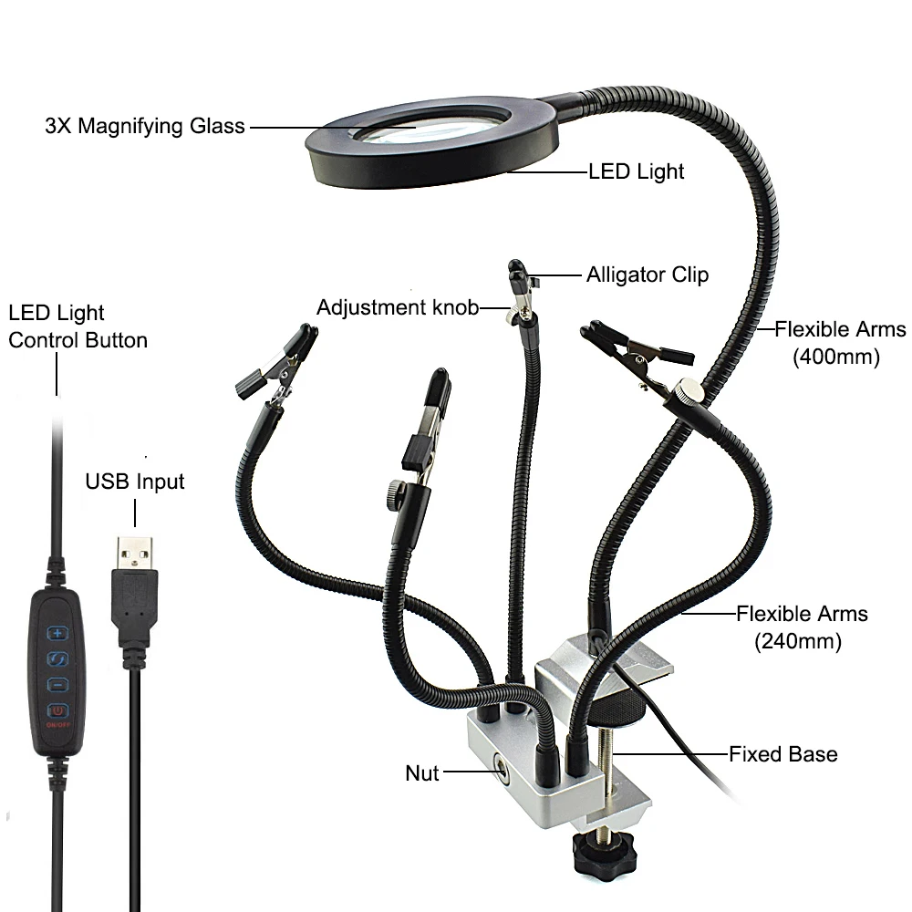 Product Name: Newacarax LED 3X lupa Banco tornillo de banco para mesa abrazadera soldadura ayuda mano Estación de soldadura USB 5 piezas brazos flexibles herramienta de tercera mano